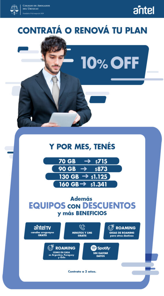 noviembre 22, 2023 Apoyo para el ejercicio de la profesión, Beneficios 0 Antel Consulte en los locales de Antel por el beneficio del Colegio de Abogados del Uruguay mostrando la constancia de socio.10 % de descuento en contratos nuevos como renovaciones. Ver adenda del convenio.